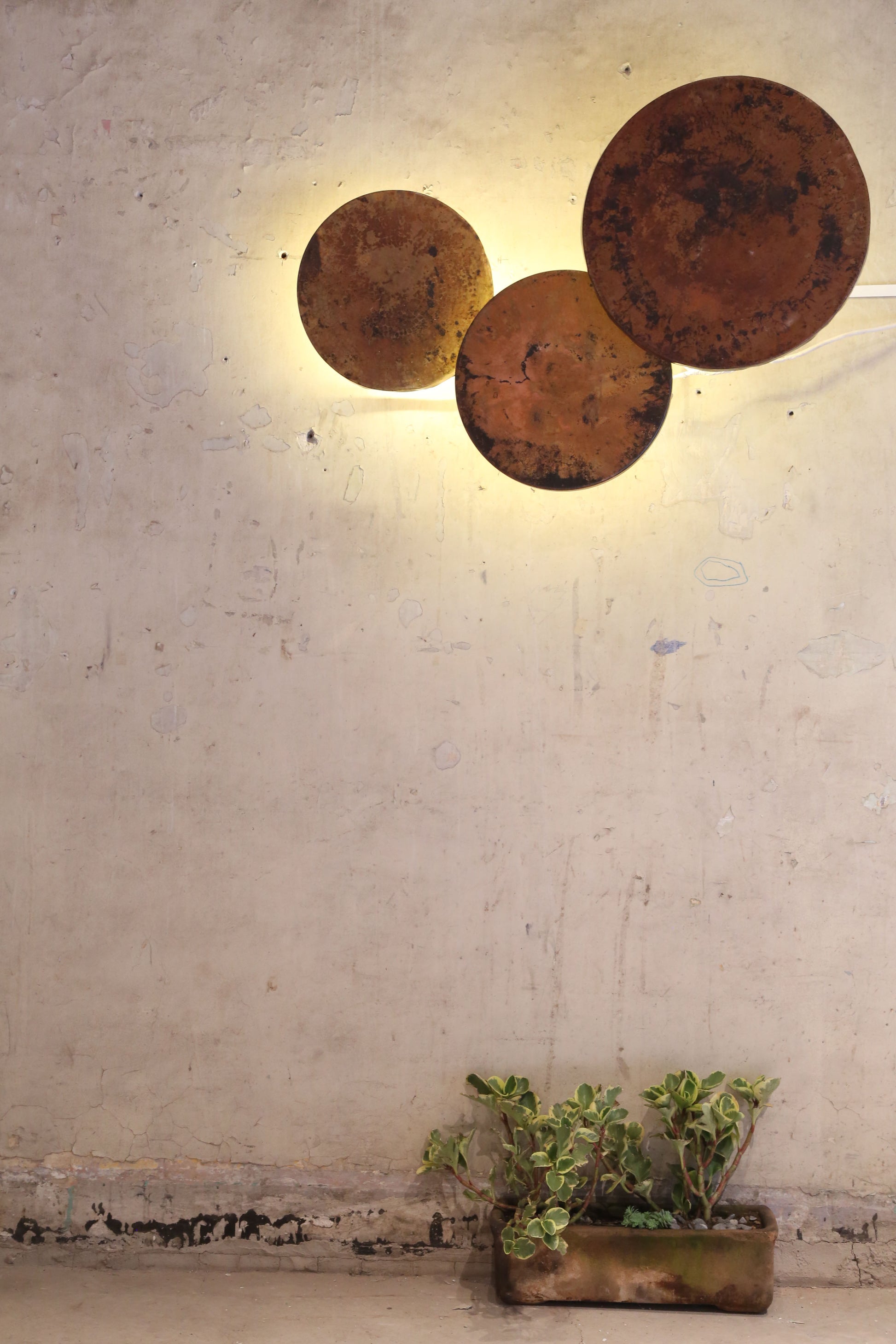 Lámpara empotrable con tres discos de cobre martelinado con base de madera de Cedro. Iluminación led cálida.