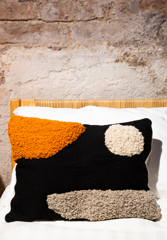 Cojín de lana natural con texturas irregulares. No incluye relleno. Elaborado por artesanos de Teotitlán del Valle, Oaxaca.