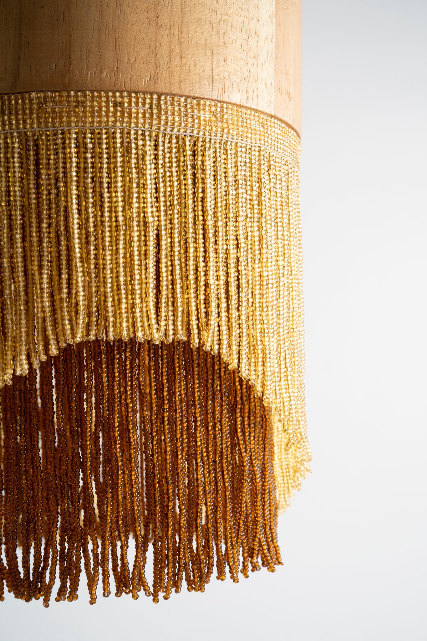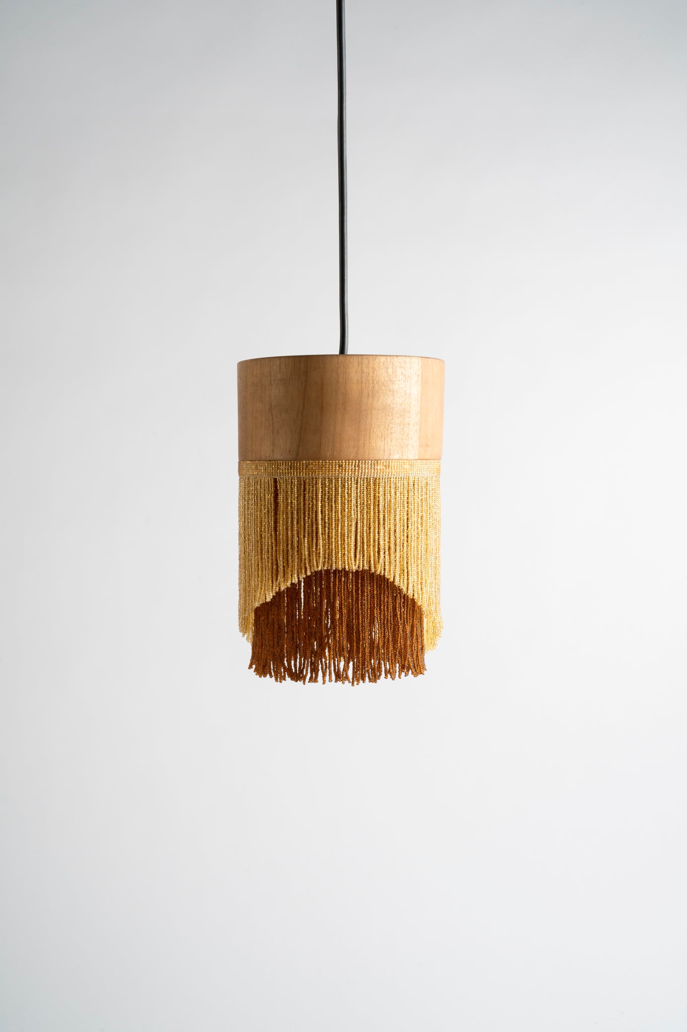 Lámpara colgante con dos faldas tejidas de chaquira con colores traslúcidos. Base de madera de cedro torneada. Incluye cable de uso rudo negro liso. No incluye foco.
