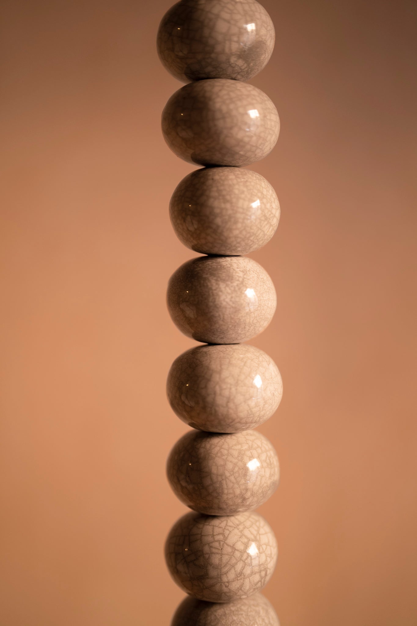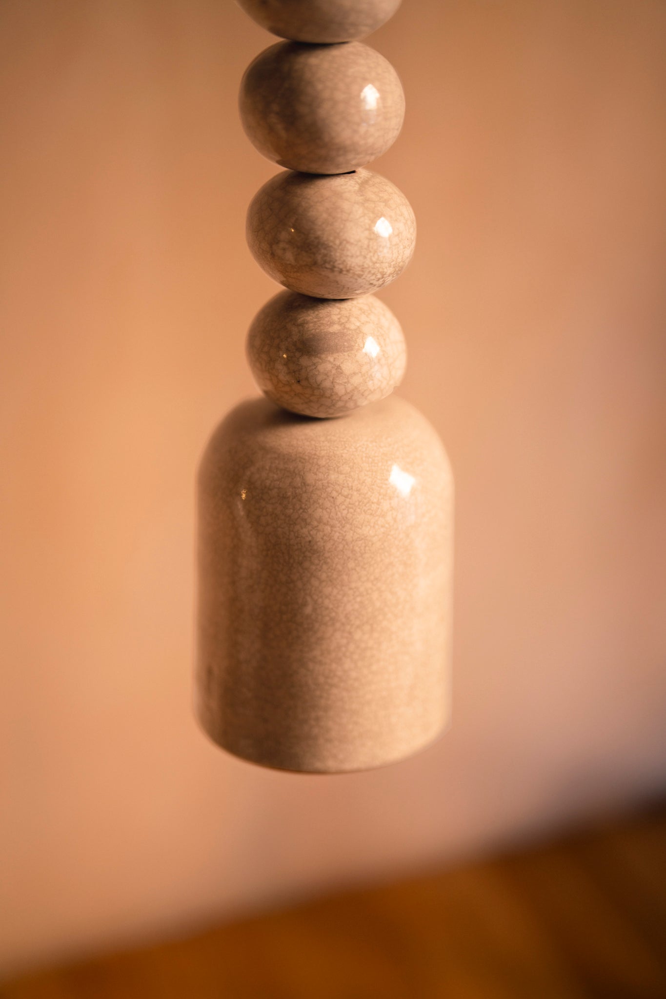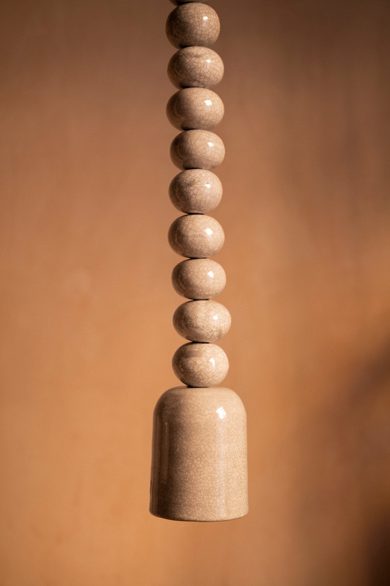 Lámpara colgante de barro rojo de Zautla, Puebla. Incluye 13 bolas de barro esmaltado blanco con acabado craquelado.