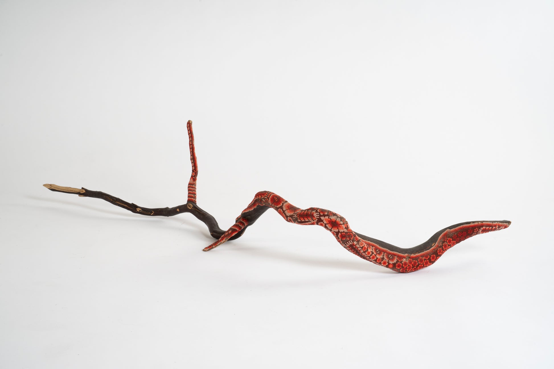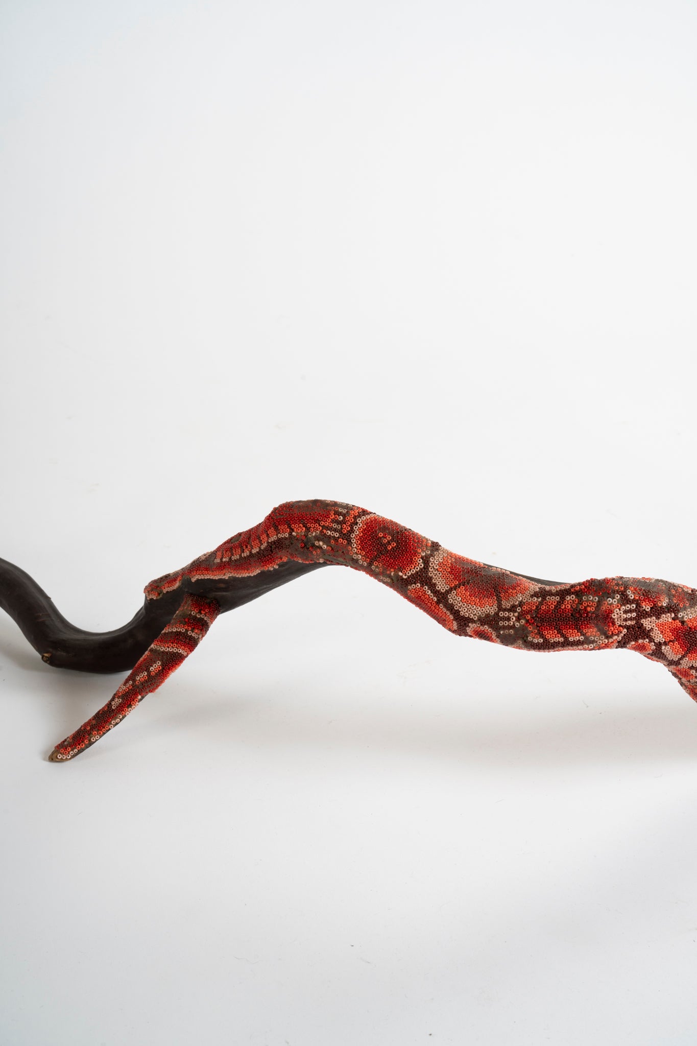 Rama de pingüica con aplicación de chaquira en arte wixarika con cuatro colores. Medidas irregulares.