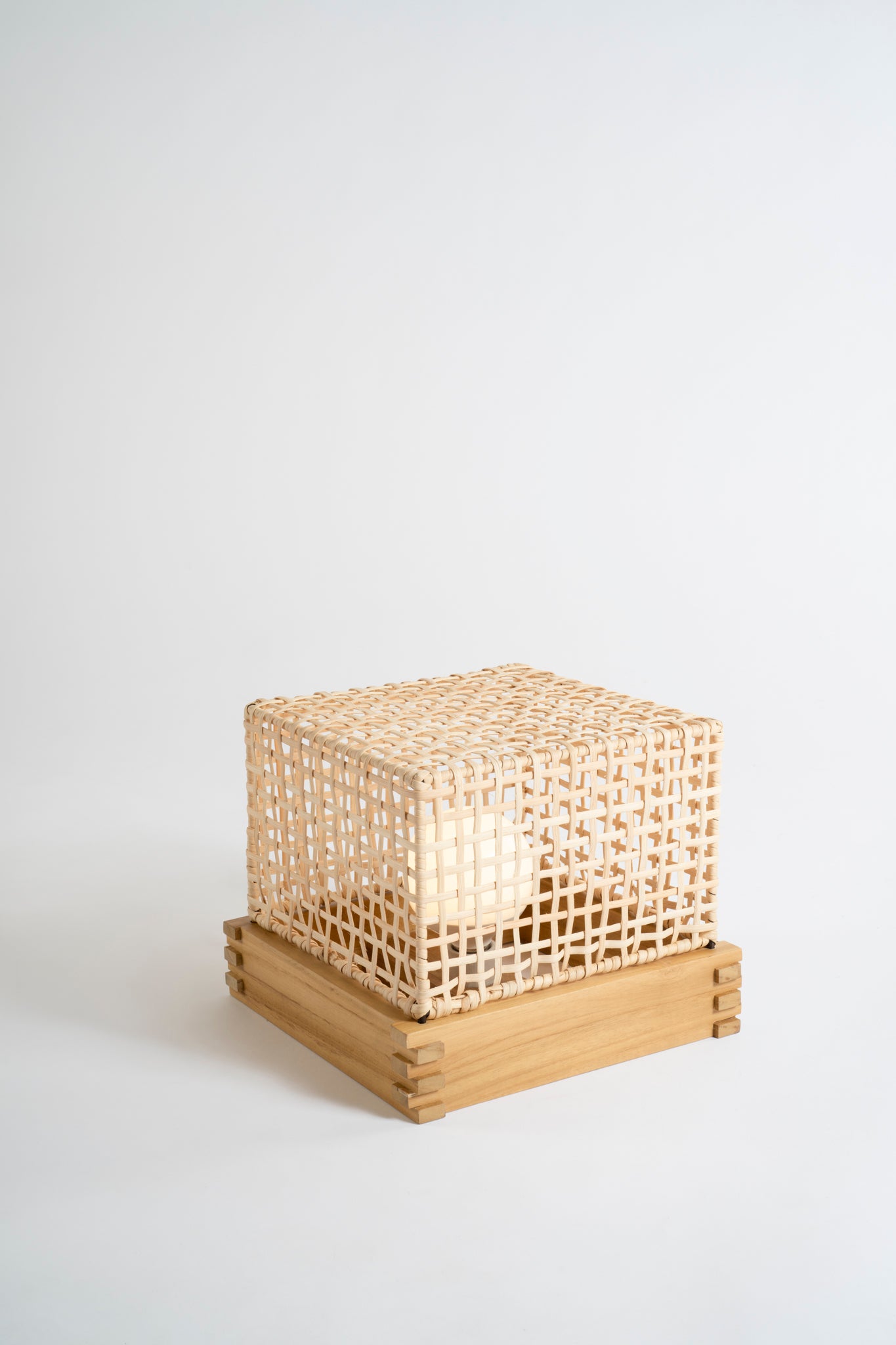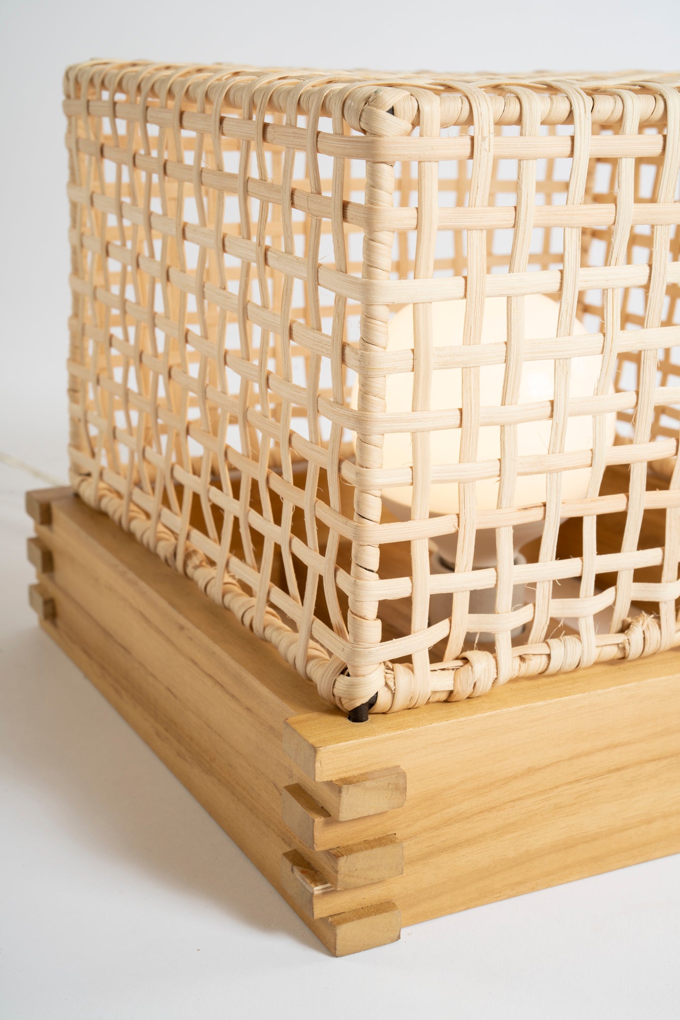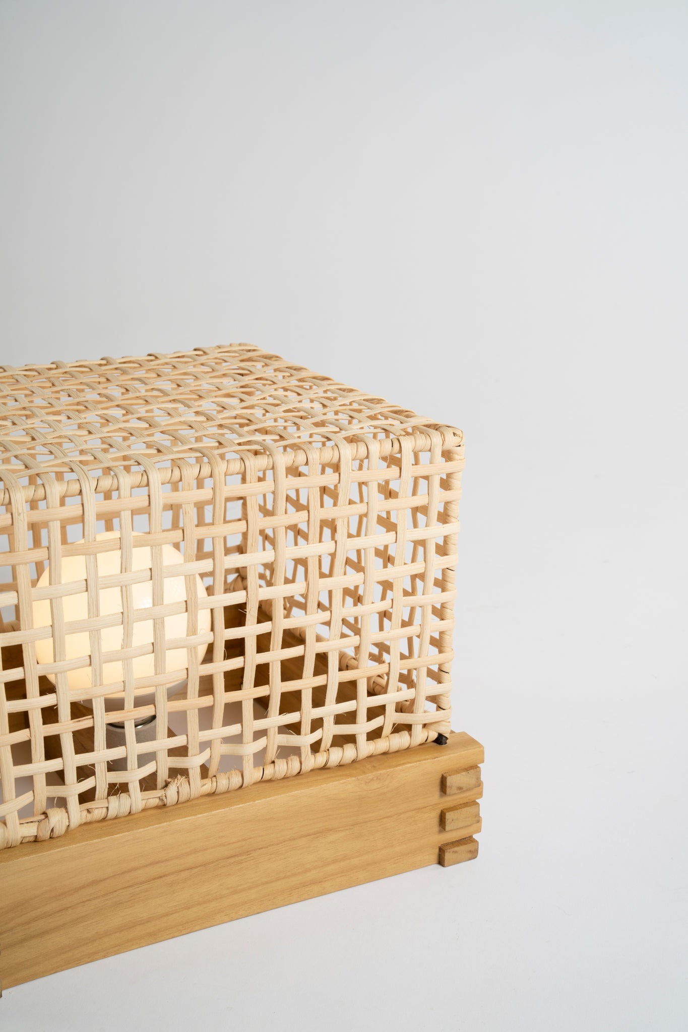 Lámpara de mesa fabricada en madera de Parota con estructura de metal tejida con raja de mimbre. Incluye cable de uso rudo transparente. No incluye foco.