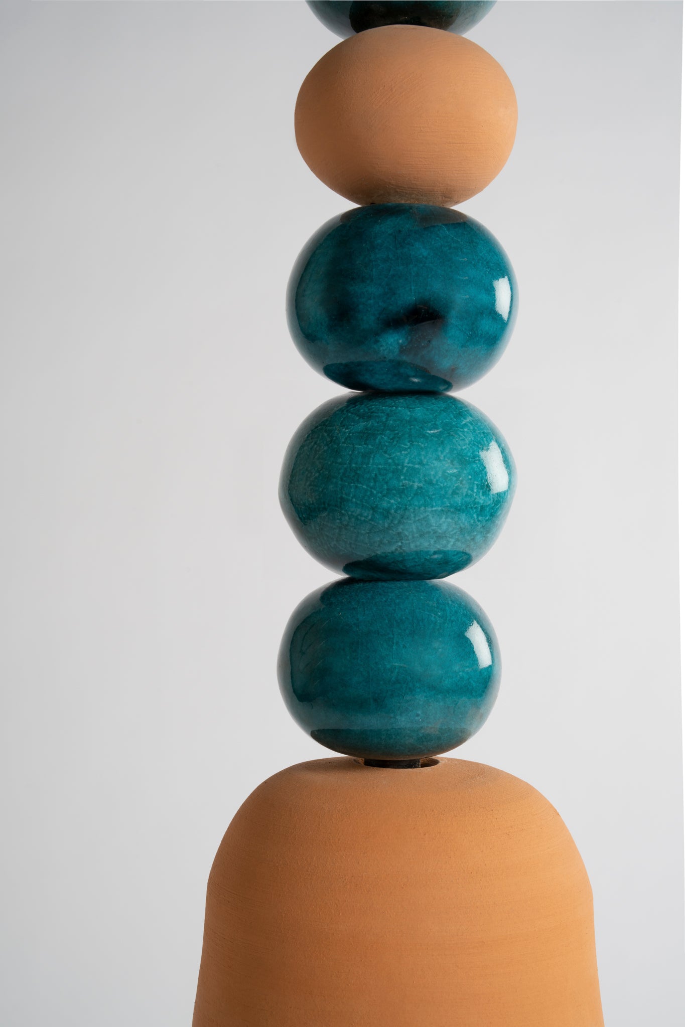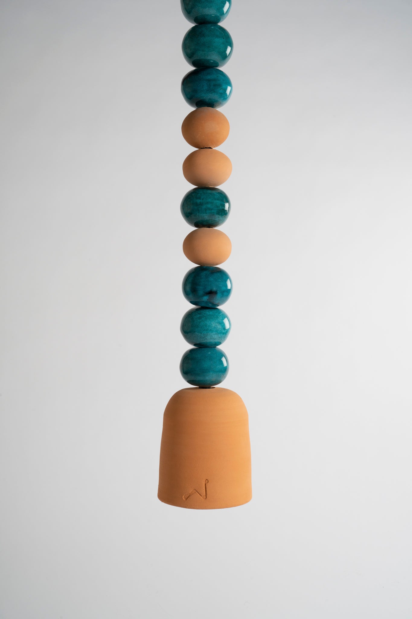 Lámpara colgante de barro rojo. Incluye ocho bolas de barro esmaltada color zautla, 6 esferas de barro rojo natural y una campana de barro rojo natural. Incluye cable de uso rudo negro liso. No incluye foco. Elaborado por artesanos de Zautla, Puebla.